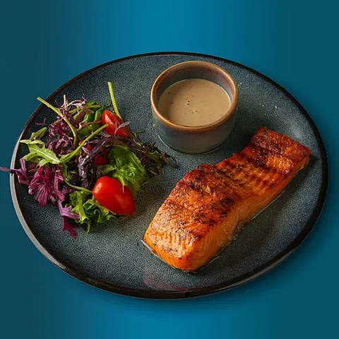 Стейк из форели с овощным салатом и ореховым соусом