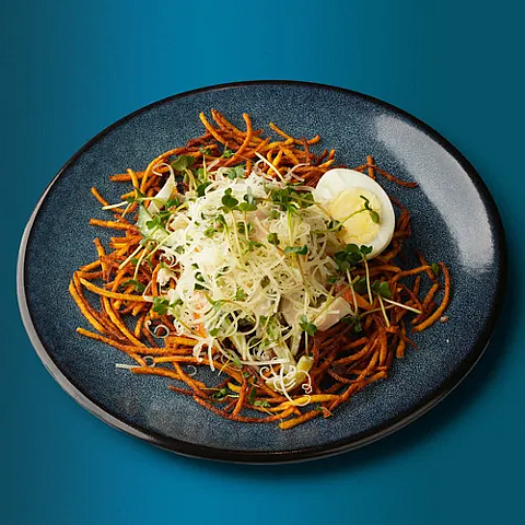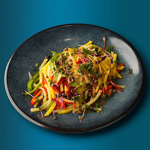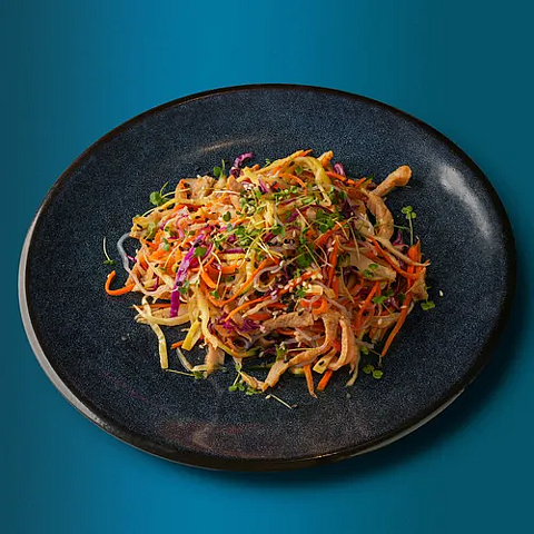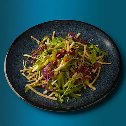 Дайкон, перец зеленый острый, кинза, лук, чеснок, перец чили, масло раст, арахис, соевый соус, черный уксус, кунжутное масло, перечное масло, микрозелень