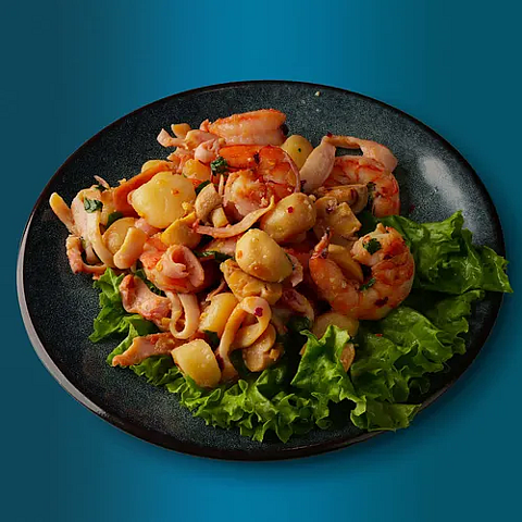 королевские креветки, кальмары, гребешки, шампиньоны, кинза, чили, чеснок, оливковое масло, китайские специи