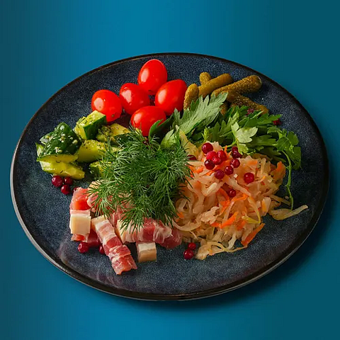 Соленое сало, консервированные огурчики, черри, капуста квашенная, огурцы с чесноком, брусника