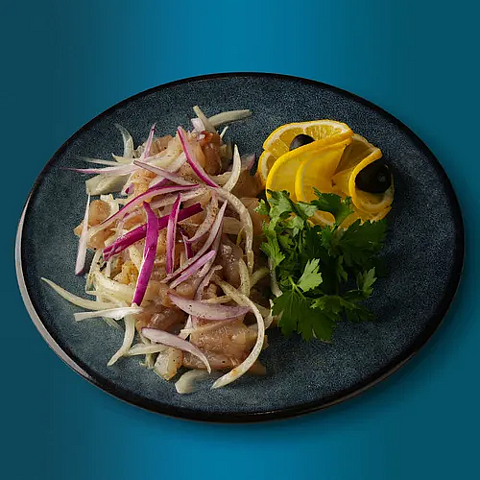 Строганина из байкальской рыбы, лук репчатый