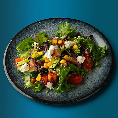 Салат айсберг, тунец слабосоленый, черри, перец болгарский, сыр творожный, кукуруза, огурец свежий, китайская заправка
