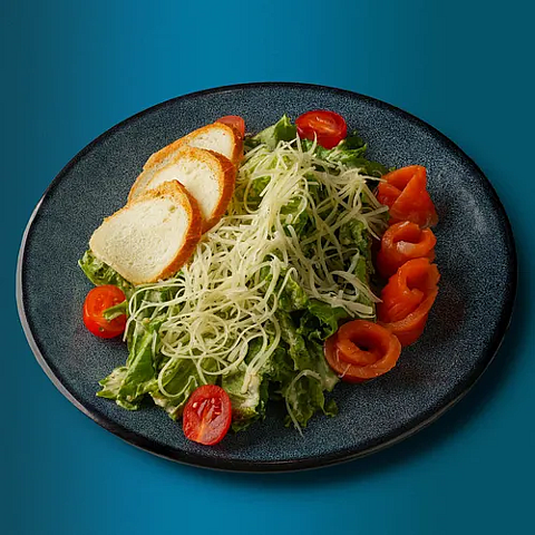 Салат айсберг, форель слабосоленая, черри, сухарики, сыр пармезан, соус цезарь