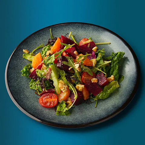 Свекла, апельсин, черри, руккола, сыр творожный, лист салата, имбирная заправка