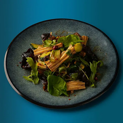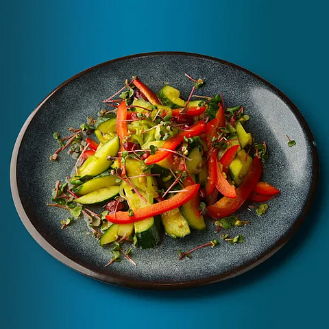 Огурец, чеснок, смесь перцев, спаржа, масло раст, древесные грибы, соевый соус, черный уксус, кунжутное масло, кинза, арахис, микрозелень