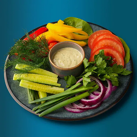 Свежие томаты, сочные огурчики, перчик, зелень, лук красный, соус цезарь