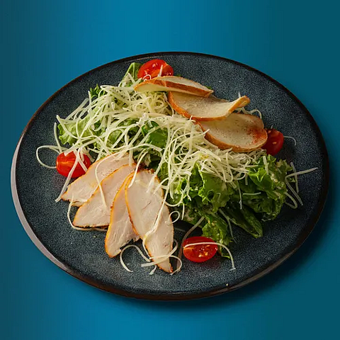 Салат айсберг, куриное филе, черри, сухарики, сыр пармезан, соус цезарь