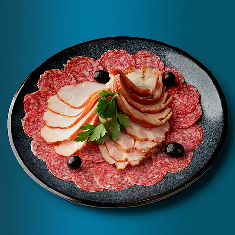 Колбаса пепперони, грудинка холодного копчения, карбонад, куриный рулет