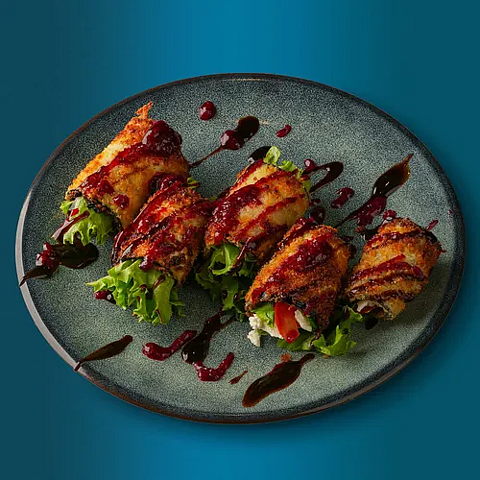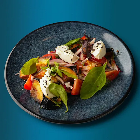 Баклажан, томат, кинза, шпинат, соус чили сладкий, кунжут, сливочный сыр, лук красный